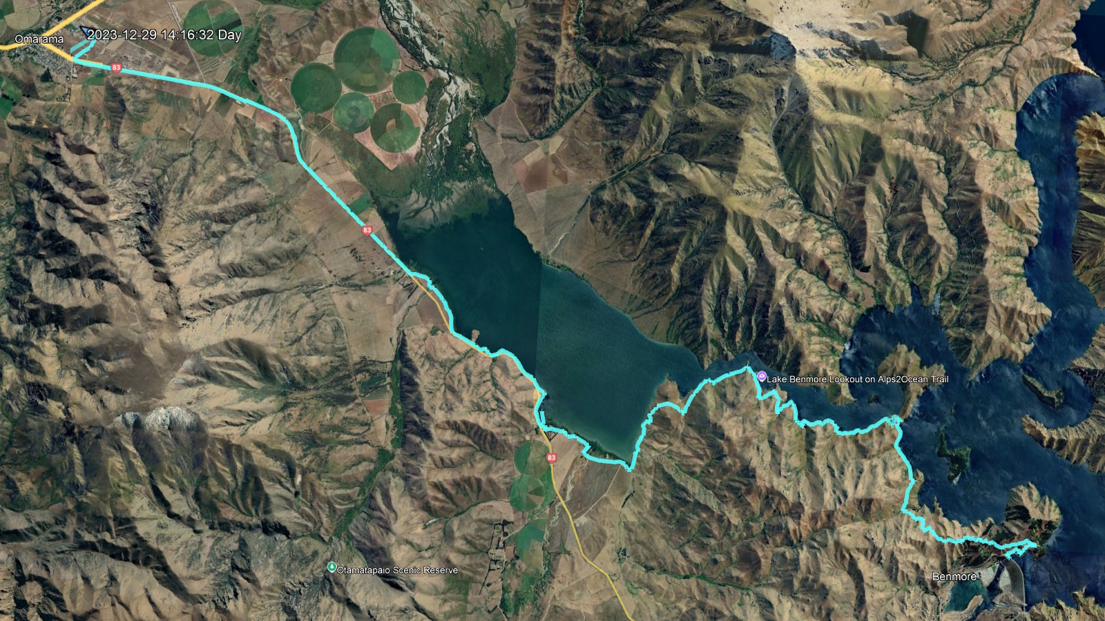 A map of today’s track, from Omarama to the Benmore Dam and back, 60.6 km