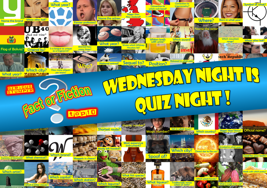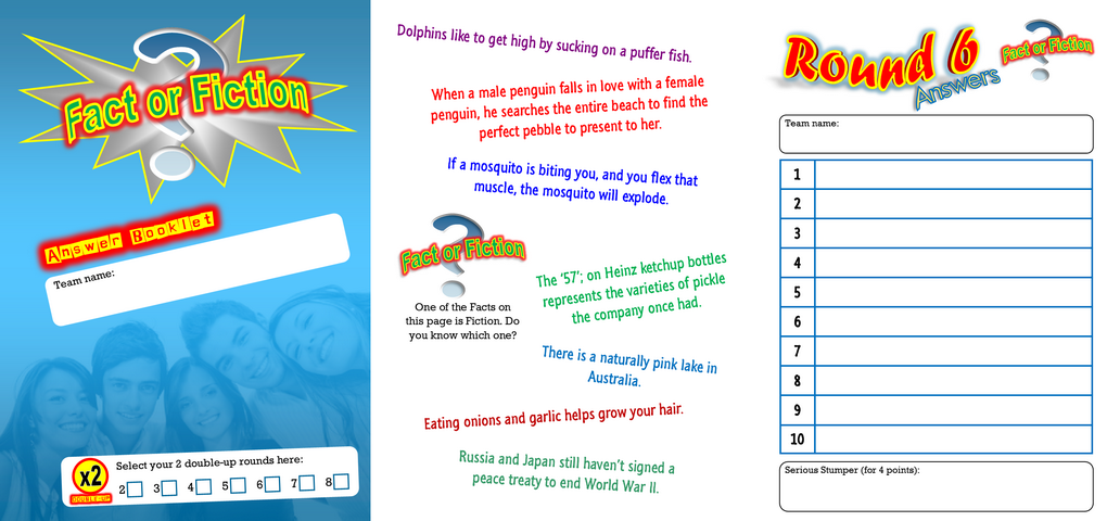 Below you can see a 10 questions demo of the Fact or Fiction quiz, an example of a topics sheet, the answer booklet, scoreboard and advertisement.