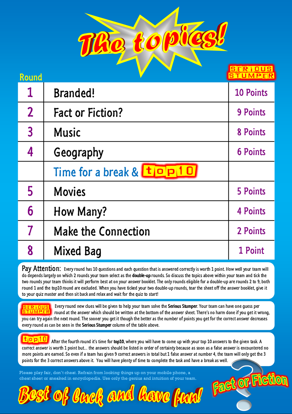 Example of the topics sheet with 8 rounds and the Serious Stumper and top10: